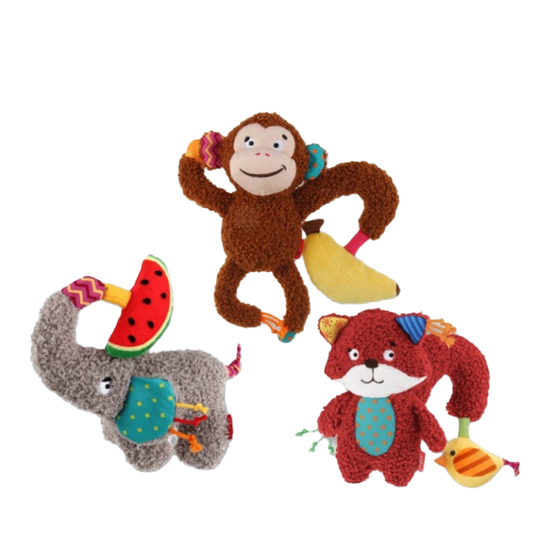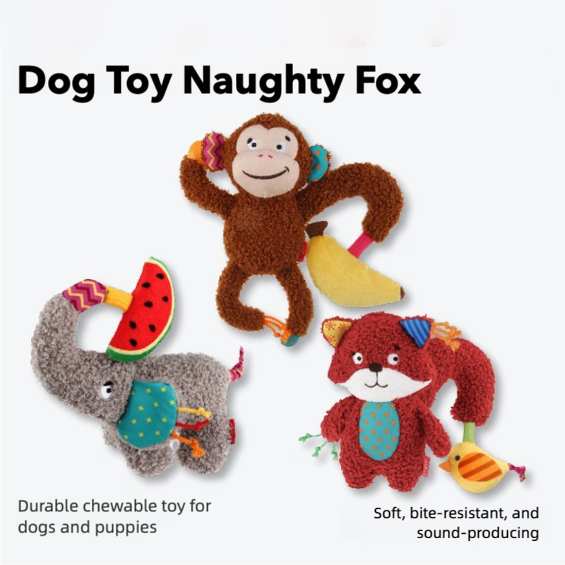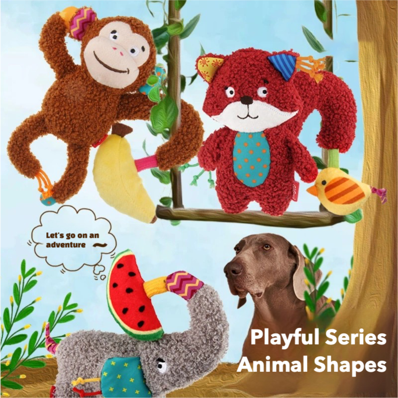 Plush Squeaky Dog Toys | Monkey, Fox, Elephant Animal Shapes | Crinkle & Chew Toys for Puppies and Small Dogs